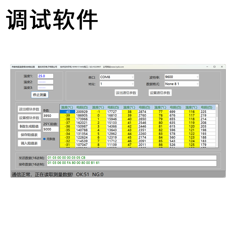 同時測量3路熱敏電阻(NTC)溫度傳感器,測量熱敏電阻阻值,通過B值進行換算,轉換成溫度,通過RS485通信或模擬量變送輸出。RS485通信接口,采用標準的modbus-rtu協議,可與各種組態軟件,PLC,觸摸屏等聯網通信,通信地址:1~247;波特率:2400、4800、9600、19200、38000、57600、115200;校驗位:無校驗,奇校驗,偶校驗。模擬量變送輸出,模擬量可選DC4-20mA,DC0-20mA,DC0-5V,DC0-10V等,輸出的模擬量與測量溫度成正比。電源輸入范圍DC9~36V,電源,輸入信號,RS485通信,模擬量變送輸出之間相互電氣隔離,隔離電壓≥2KV。提供參數設置上位機軟件,方便對模塊參數設置及通信調試。定貨時,要提供NTC B值和25度時阻值。