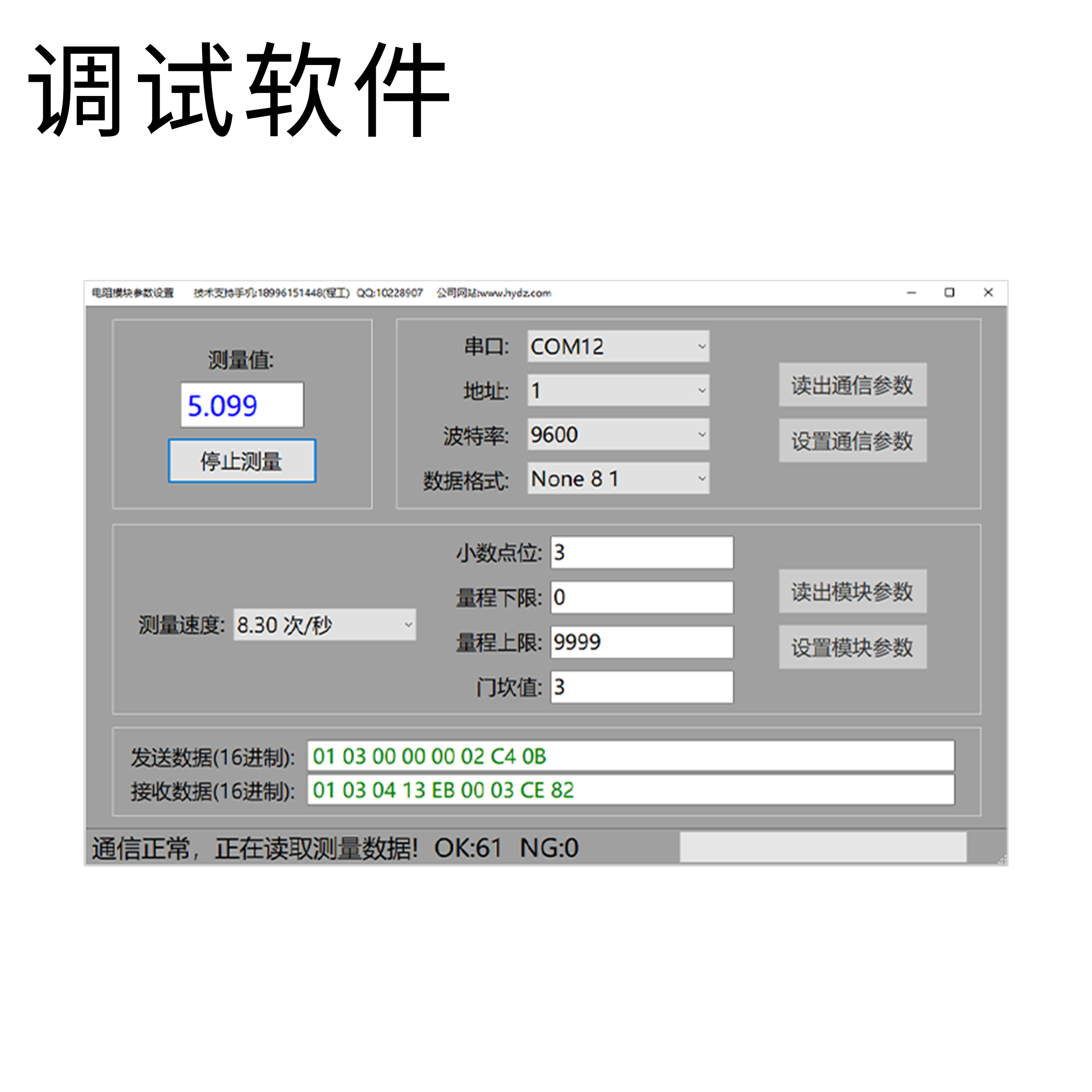 電阻測量,支持2線制接法電阻測量和4線制接法電阻測量,最小分辨率到1mΩ,通過RS485通信或模擬量變送輸出。RS485通信接口,采用標準的modbus-rtu協(xié)議,通信地址:1~247;波特率:2400、4800、9600、19200、38000、57600、115200;校驗位:無校驗,奇校驗,偶校驗。模擬量變送輸出,模擬量可選DC4-20mA,DC0-20mA,DC0-5V,DC0-10V等,輸出的模擬量與測量電阻值成正比。電源輸入范圍DC9~36V,電源,輸入信號,RS485通信,模擬量變送輸出之間相互電氣隔離,隔離電壓≥2KV。提供參數(shù)設置上位機軟件,方便對模塊參數(shù)設置及通信調(diào)試。