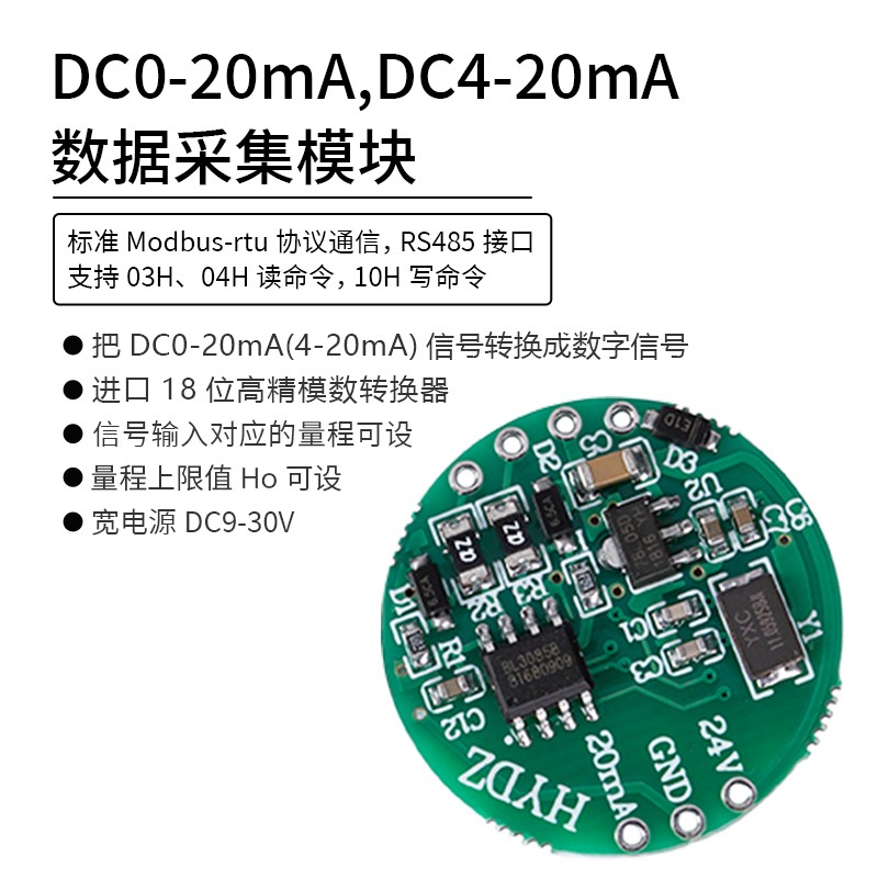 DC0-20mA(DC4-20mA)數(shù)據(jù)采集模塊,采用進口18位高精模數(shù)轉(zhuǎn)換器把DC0-20mA(4-20mA)信號轉(zhuǎn)換成數(shù)字信號,通過RS485通信接口,標(biāo)準(zhǔn)modbus-rtu協(xié)議輸出。通信地址:1~247;波特率:2400、4800、9600、19200、38000、57600、115200;校驗位:無校驗,奇校驗,偶校驗。DC0-20mA(4-20mA)信號輸入對應(yīng)的量程可設(shè),出廠設(shè)置DC0-20mA(4-20mA)對應(yīng)0-20000。提供參數(shù)設(shè)置上位機軟件,方便的對輸入信號量程,通信地址,波特率,校驗位進行設(shè)置。