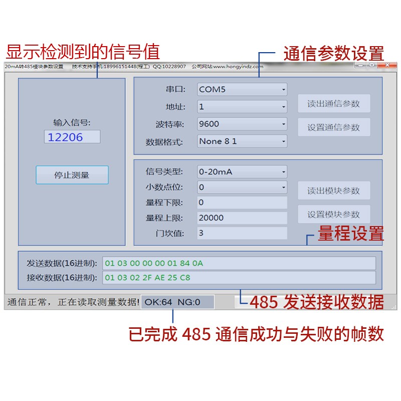 參數(shù)設(shè)置舉例說明:1,輸入信號類型選擇為DC0-20mA,量程小數(shù)點位dot=3,量程下限值Lo=0,量程上限值Ho=20000,些時輸入電流8mA,通信整數(shù)讀數(shù)為8000,float讀數(shù)為8.000;2,輸入信號類型選擇為DC4-20mA,量程小數(shù)點位dot=2,量程下限值Lo=0,量程上限值Ho=20000,些時輸入電流8mA,通信整數(shù)讀數(shù)為5000,float讀數(shù)為50.00;3,輸入信號類型選擇為DC4-20mA,量程小數(shù)點位dot=2,量程下限值Lo=0,量程上限值Ho=-1600,些時輸入電流8mA,通信整數(shù)讀數(shù)為-400,float讀數(shù)為-4.00。
